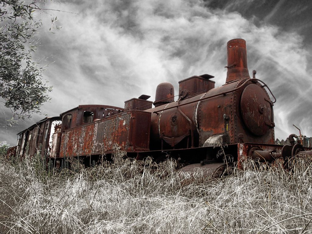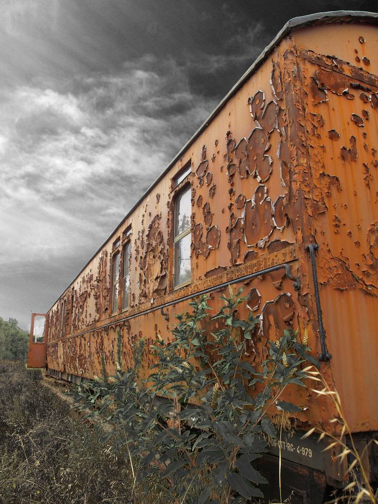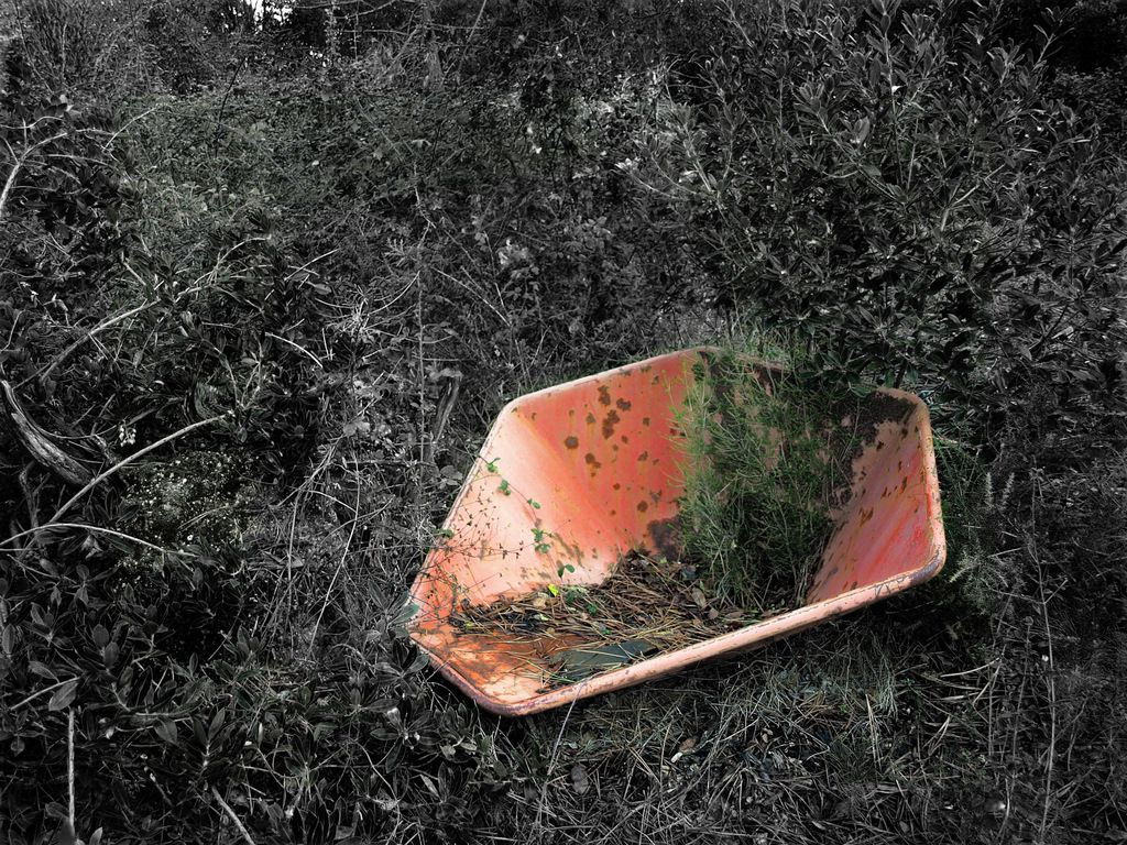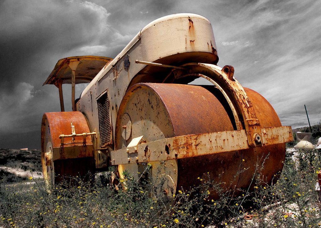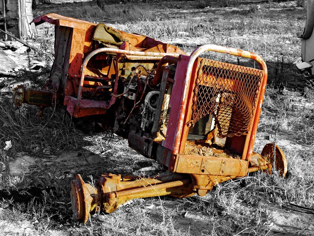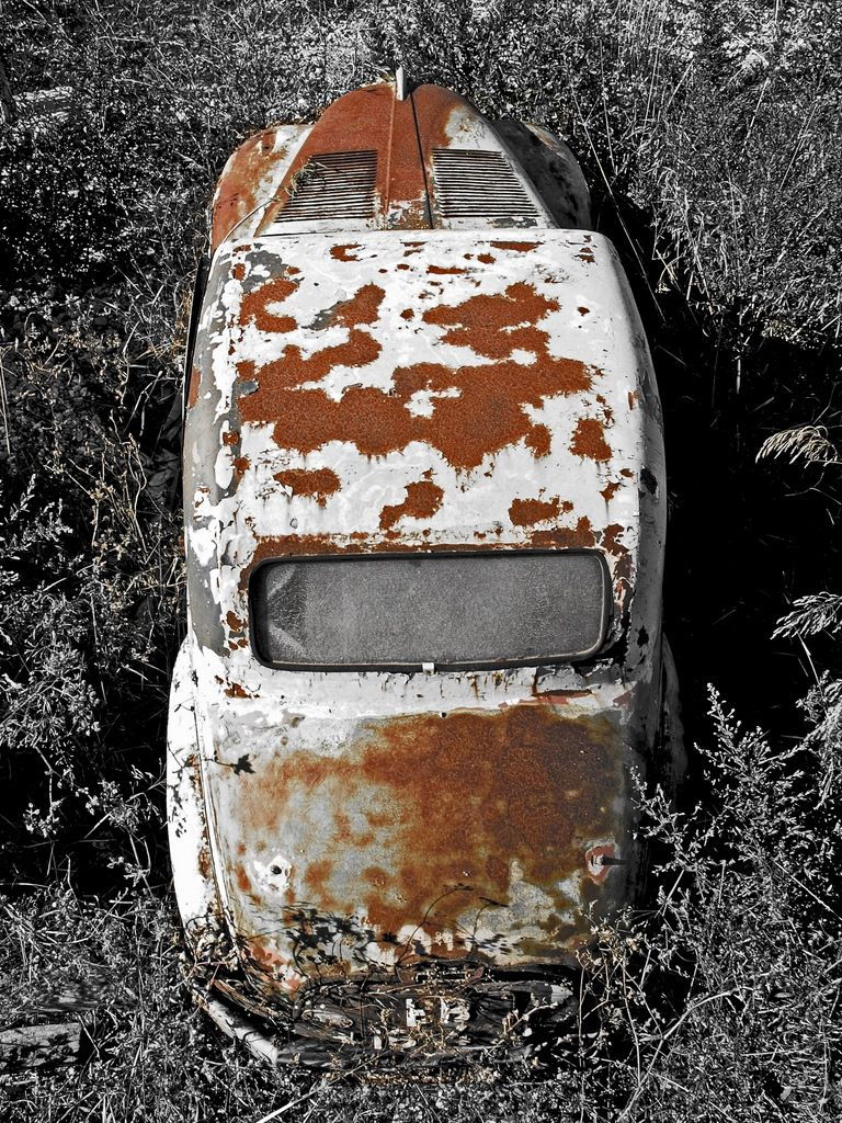 que retrata objectos ferrugentos e abandonados na natureza, serve como chamada